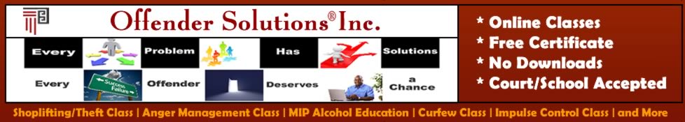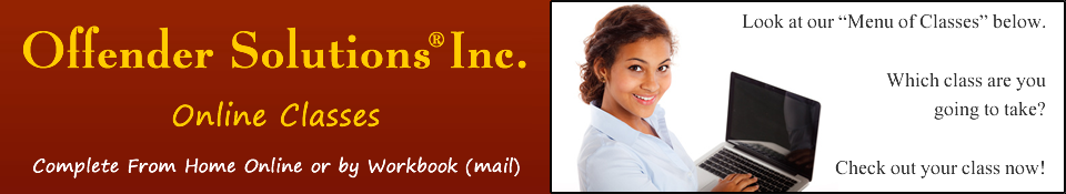 Online California Anger Management Class: Don't want to sit in a group of other people and be forced to "make confessions"? Take your class online - on your timelines. The Offender Solutions® series of 100% online classes is a nationwide service that offers a variety of adult and juvenile online classes. Our classes are designed to be easy, informative, self paced, convenient and, of great importance - affordable. 100% online, no lectures and no judgments.