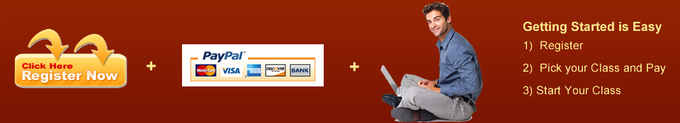 Payments are made securely online through PayPal or credit card or by mail. For online classes you first register and then make a payment.